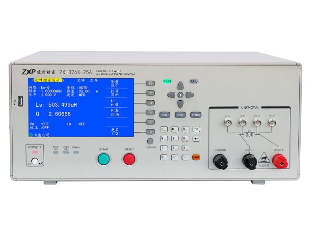 ZX1376是內建高頻LCR數字電橋和0~25A直流偏置電流源的電橋偏流一體機,低達0.25mA的電流分辨率,25A時輸出電壓高達11V,可分析電感器中鐵心的特性,作為電感器質量檢測或產品特性的分析。內置的偏流源噪聲更小,控制更靈活;內建比較器,方便組建到電感器檢測的自動化生產線。ZX1376型號僅含0~25A直流偏置電流源,可通過標準RS232C接口方便的與外部LCR表連接。